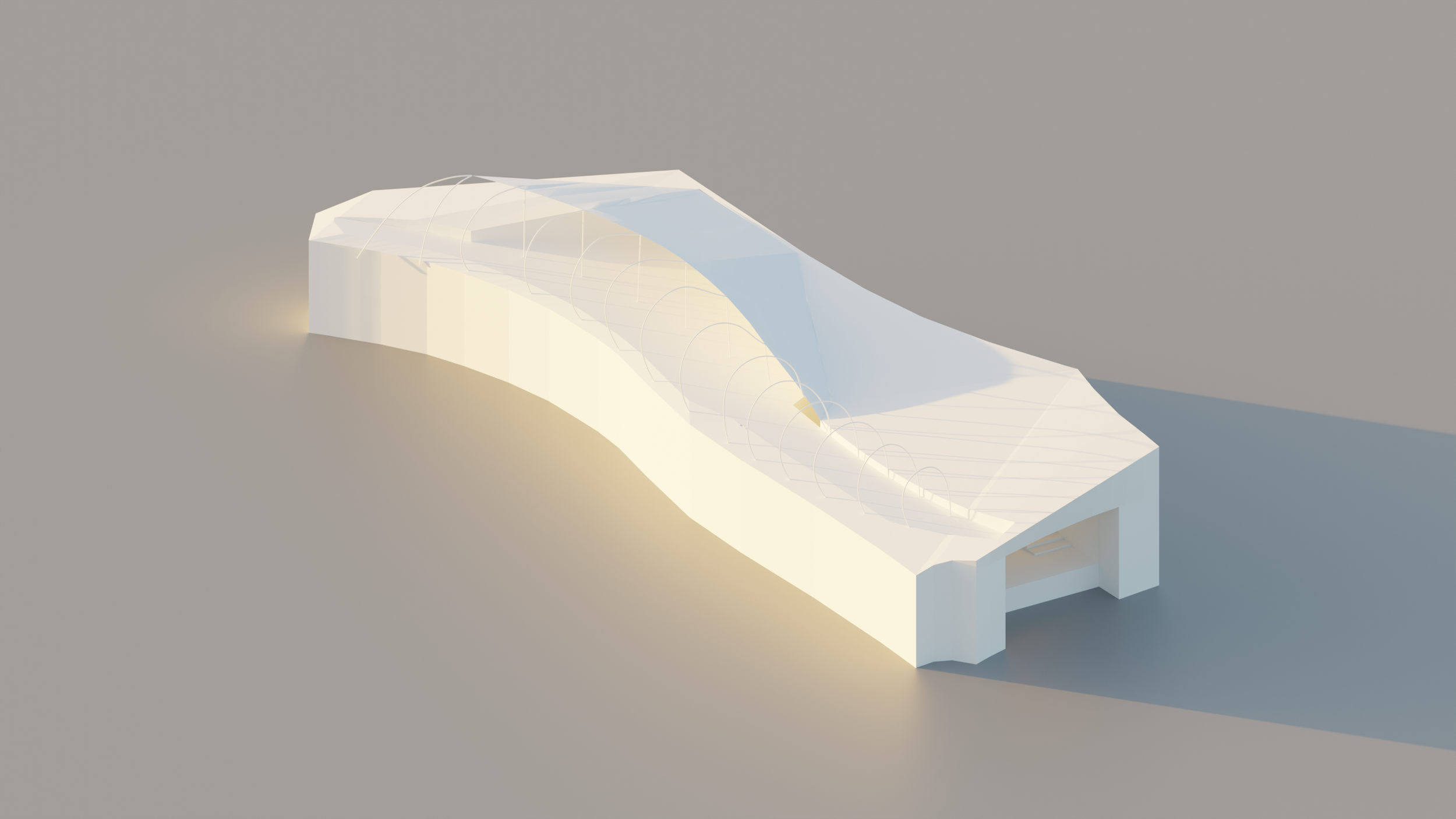 My final project for the embARC summer architecture program is the fern pavilion. It is the culmination of all the skills and ideas that I had explored in the program. I was inspired by the fragmented shade provided by ferns to construct a promenade cover while utilizing the wet and shaded environment of ferns to design the interior. While the slits cover the promenade from the sun, they also allow pedestrians to view out over the well groomed gardens. In order to get the accurate dimensions for the model, I created a net out of a 3d model in rhino and then printed it out using 49 pieces of paper. This template was then used to construct the physical model.